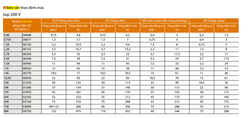 | Biến Tần Mitsubishi FR-A820-45K: 3 pha 200VAC 45KW, loại tiêu chuẩn |