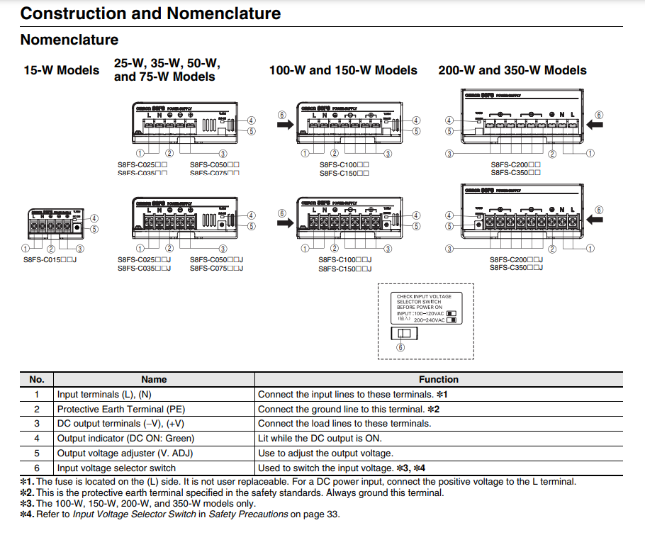 | S8FS-C05012J: Điện áp nguồn cấp 100-240 VAC, Điện áp ngõ ra 12VDC, công suất 50W-4.2A |