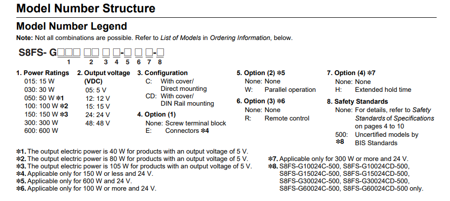 | S8FS-G10024CD-500: Điện áp nguồn cấp 100-240 VAC, Điện áp ngõ ra 24VDC, công suất 100W-4.5A |