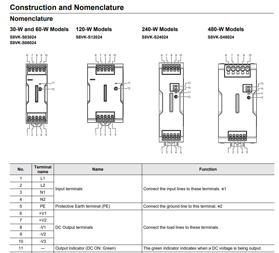 | S8VK-S24024: Điện áp nguồn cấp 100-240 VAC, Điện áp ngõ ra 24VDC, công suất 240W-10A |