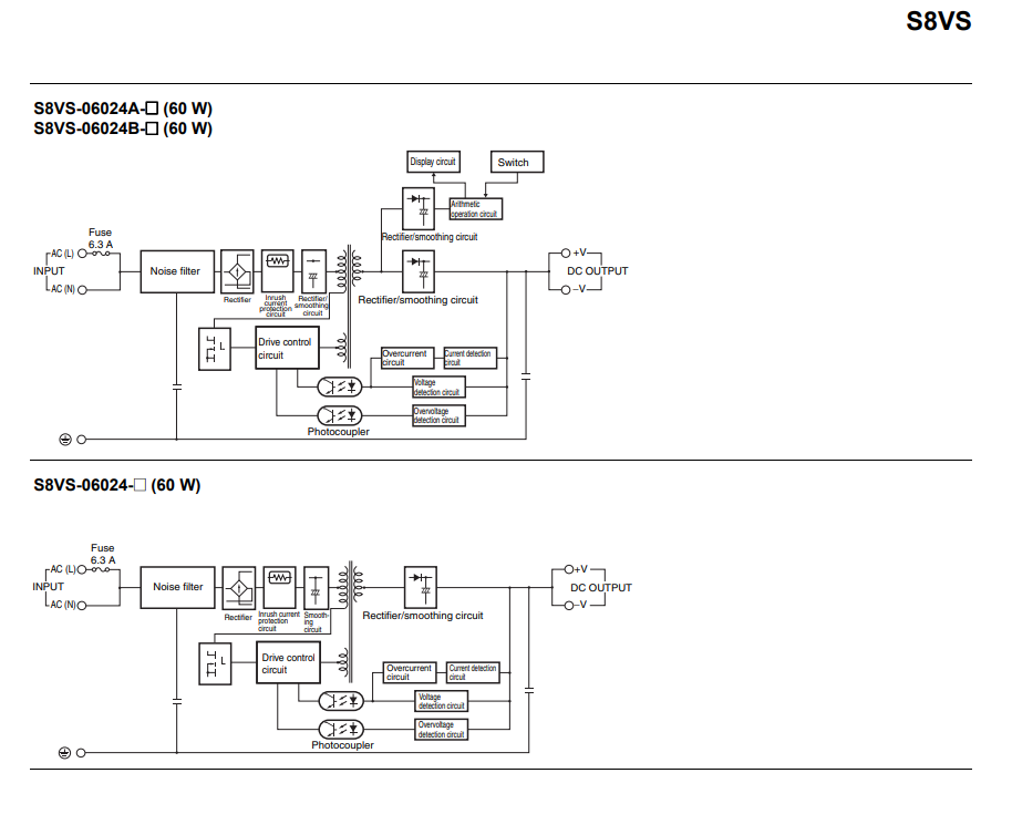 | S8VS-06024: Điện áp nguồn cấp 100-240 VAC, Điện áp ngõ ra 24VDC +/-10%, hiển thị dòng áp ngõ ra, công suất 60W-2.5A |