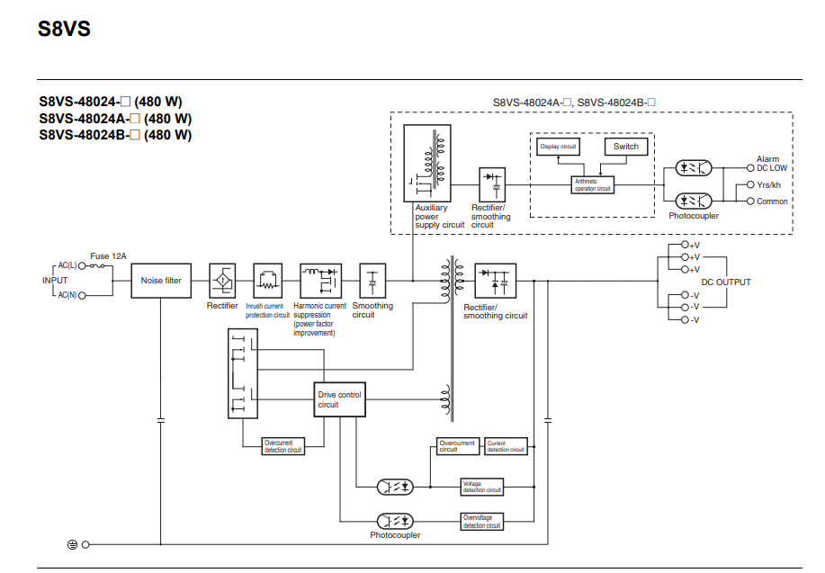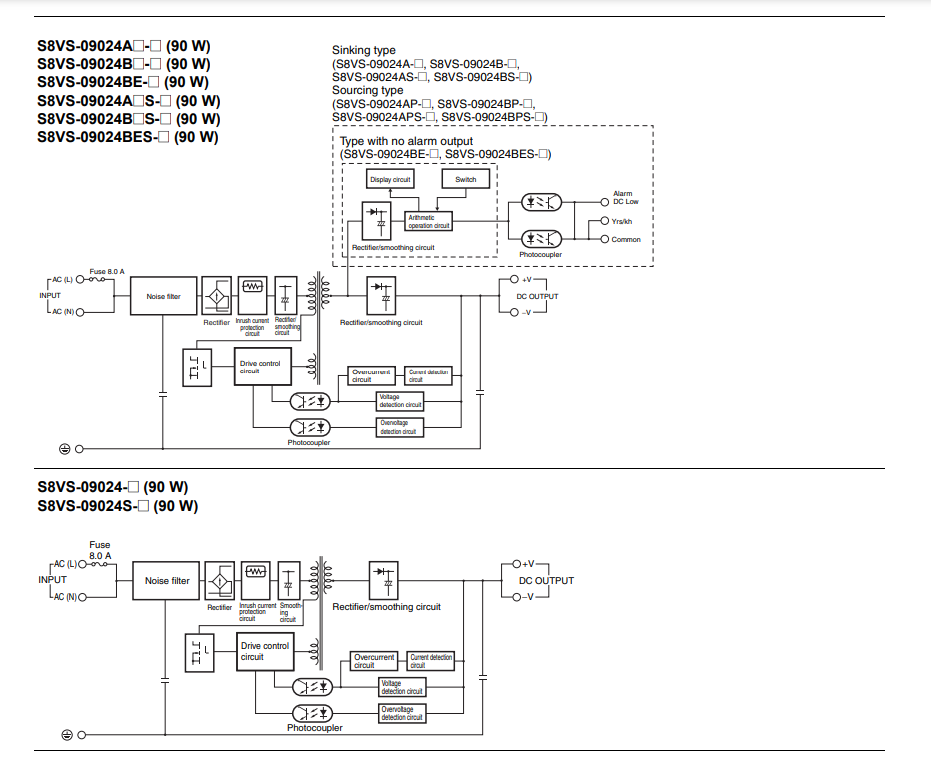 | S8VS-09024: Điện áp nguồn cấp 100-240 VAC, Điện áp ngõ ra 24VDC +/-10%, hiển thị dòng áp ngõ ra, công suất 90W-3.75A |