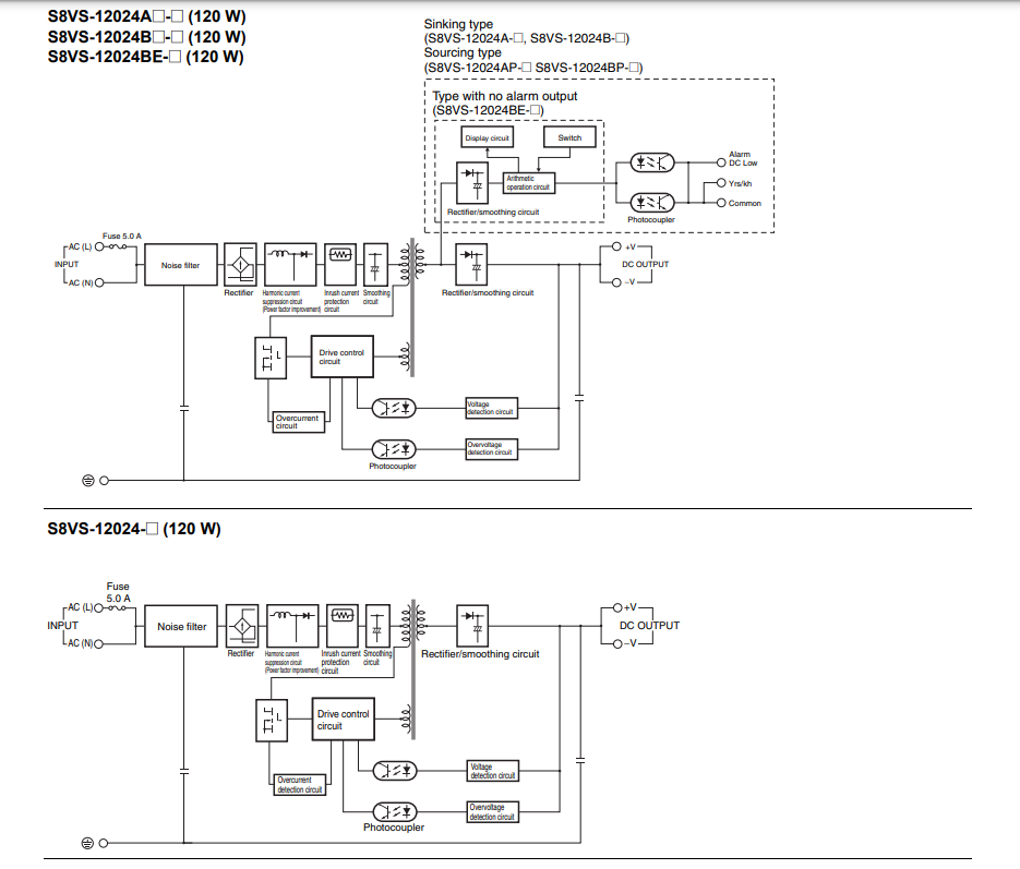 | S8VS-12024: Điện áp nguồn cấp 100-240 VAC, Điện áp ngõ ra 24VDC +/-10%, hiển thị dòng áp ngõ ra, công suất 120W-5A |