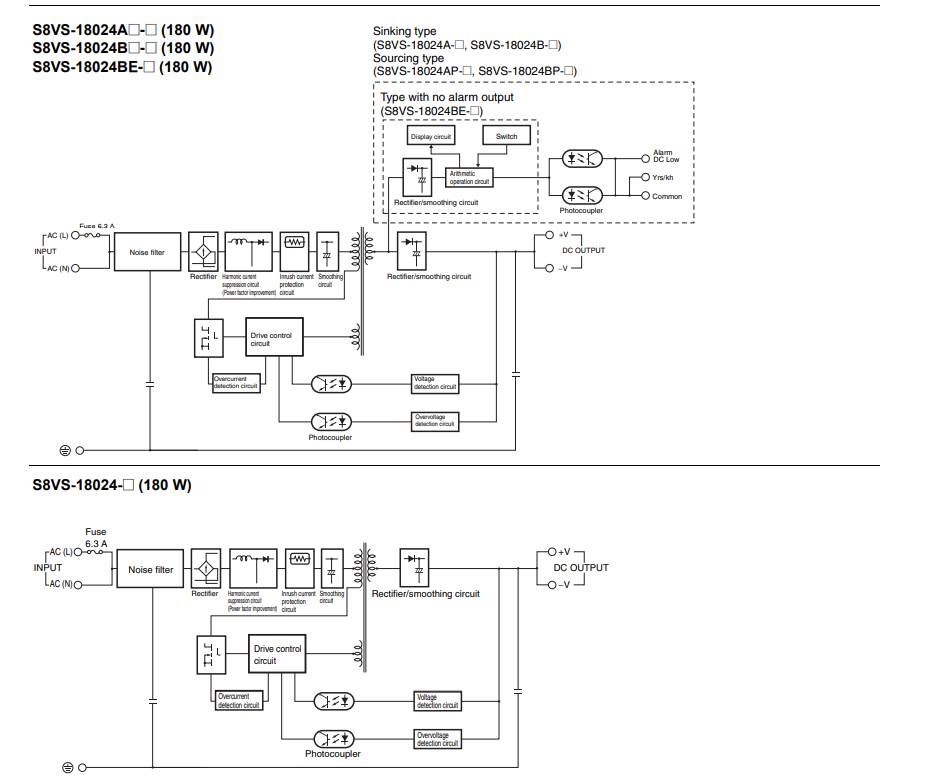 | S8VS-18024: Điện áp nguồn cấp 100-240 VAC, Điện áp ngõ ra 24VDC +/-10%, hiển thị dòng áp ngõ ra, công suất 180W-7.5A |
