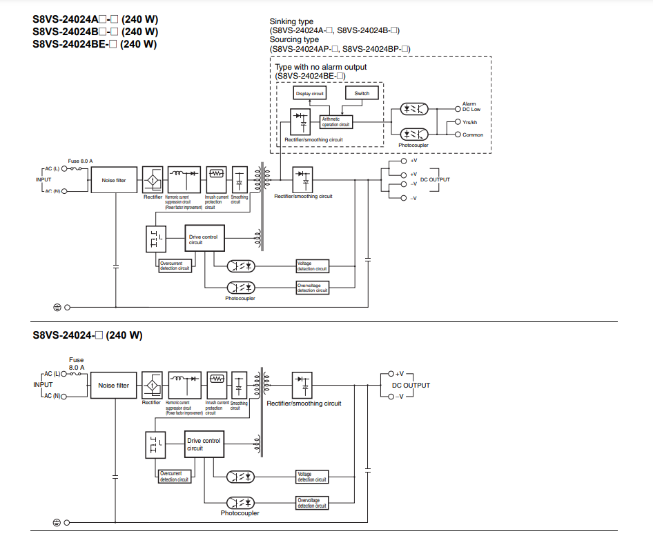 | S8VS-24024: Điện áp nguồn cấp 100-240 VAC, Điện áp ngõ ra 24VDC +/-10%, hiển thị dòng áp ngõ ra, công suất 240W-10A |