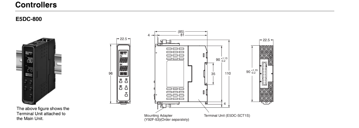 - Một lưu ý nhỏ là với kích thước nhỏ gọn 22.5 x 96 mm, các model thuộc bộ ổn nhiệt E5DC-800 không sử dụng màn hình hiển thị chỉ số.