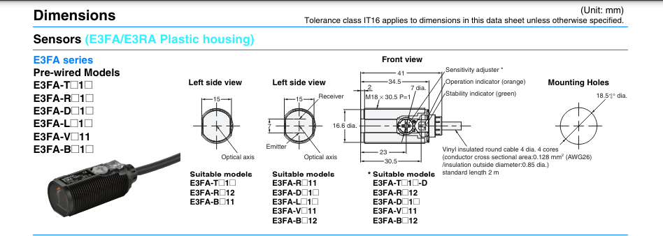 Trực thuộc series cảm ứng quang của Omron, cảm biến quang Omron E3FA/E3FB series: through-beam, Cable, PNP ứng dụng nguyên lý tương tác - phản hồi khi chùm sáng xuyên qua để kích hoạt các phản ứng nhận diện vật thể.