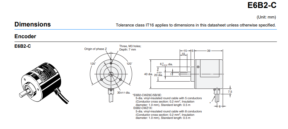 | E6B2-CWZ6C 20P/R 2M: 5-24VDC, 20 xung/vòng, NPN output, Cáp 2M |