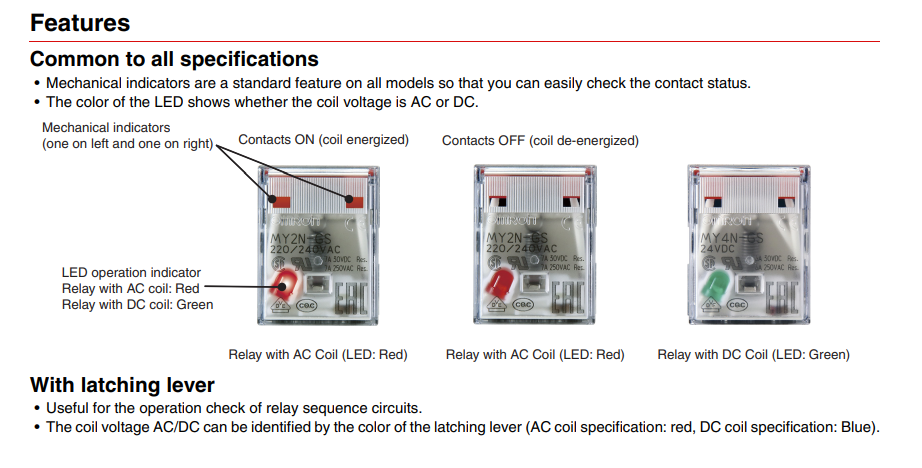 | MY2IN-GS-R AC48: Điện áp cuộn coil 48 VAC, 8 chân dẹt, latching lever, led hiển thị |